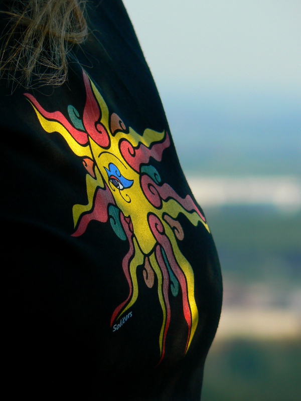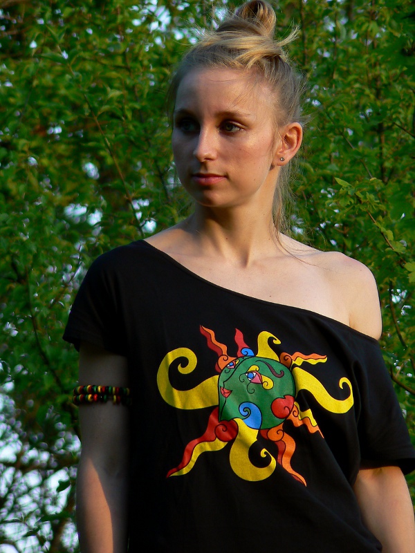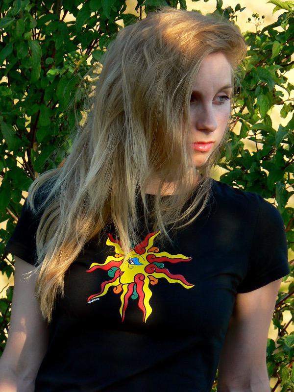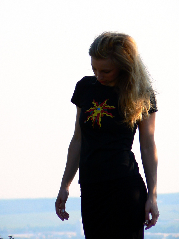 Černé dámské tričko s autorským motivem zářivého slunce z naší produkce na značce Soliters.